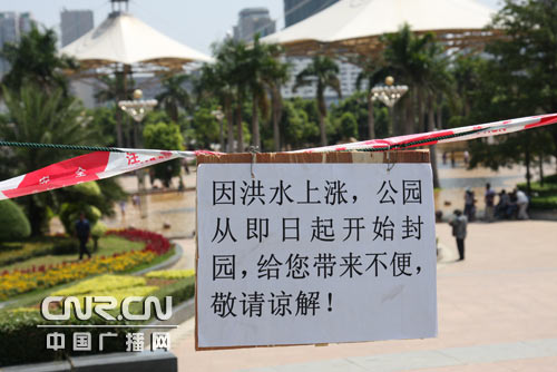由于今天是国庆长假一天,南宁天空晴朗,不少市民都举家出游。在邕江南岸的滨江公园,尽管管理人员已挂上“因洪水上涨公园停止开放……”的牌子,但仍然不少市民漫步其中,孩子们甚至打闹戏水。管理人员来回巡视,对于这样的洪水倒显得十分从容,也不过多干预。几名负责大桥安全管护的工作人员坚守在岗上。
