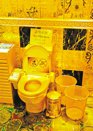 建造这座金厕所耗时一年,用了380公斤黄金、6200颗钻石及珍珠,连地面铺的都是埋藏在地下1.5亿年的木化石宝石,还用黄金珠宝做成浮雕壁画。金厕所有自动冲洗、烘干设施,每件都是金子和珠宝结合打造。