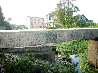 陆先生告诉记者,出于个人爱好,每到节假日,他都会带着相机、纸笔,走访郊区的各个村镇,探寻老建筑、古桥的身影。位于北蔡镇御桥村的这座御界桥,他一年多前就去看过。前天重游故地,陆先生发现,这座高约2米、宽1米半、长约17米的三跨石板桥,孤零零地横卧在几乎被填没的河道上,周围是一片瓦砾废墟。御界桥桥面由九块花岗岩石板组成,经历数百年的岁月磨砺,桥柱石上的对联只能依稀辨认出几个字,但桥身上的花纹、桥名等依然清晰可辨,整座桥较完整(见图)。