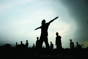 老师廉晓东(前)做一个动作,学员们马上模仿,这样可以训练协调性。