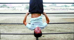 一名学员在结束训练后倒挂在训练器材上,他说,这样能锻炼身体,又能换个方式看世界。