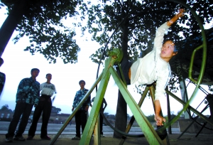 王佳琪和他的同学们最感兴趣的训练科目就是滚轮,在一个竖立在地上的直径两米的铁环内,四肢支撑在环壁上,随铁环正反旋转。“旋转时觉得嘴里酸酸的,睁着眼却看不清东西,尤其头朝下的时候。”王佳琪说。
