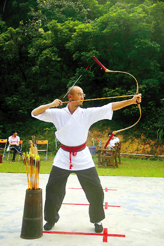 李军阳身材高大,上大学时学过散打、截拳道。“我发现我走偏了,好勇斗狠。所以想在中国传统文化中寻找心理控制的方法,我发现了射箭。孟子解释什么是‘仁’时就说:‘仁者如射。射者正己而后发,发而不中,不怨胜己者,反求诸己而已矣。’他用具体的射箭活动解释了什么是‘仁’———射箭之前先端正自己的心态,射不中也不找客观原因,而是在自己身上找问题。”李军阳入了迷,开始潜心研究《周礼》、《礼记》、《仪礼》。“你想不到在周朝时,射箭是举国进行的体育运动,不亚于希腊的奥林匹克。分四大射礼:大射礼———君臣的射箭活动;宾射礼———外交活动;燕射礼———宴会中的射箭活动;乡射礼———老百姓一年一度的体育盛会。那是一套很完善的体系,宾客如何请,主宾如何排坐次,整个活动编排,甚至司仪、裁判、教练各司什么职都清清楚楚。射箭在唐和明初都兴盛过,影响了日本、韩国。日本至今保留着周朝的射箭礼仪。”