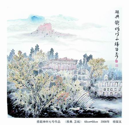 本报驻马店讯昨日,记者从驻马店市文联举办的新闻发布会上获悉:该市著名山水画家、市美协主席杨留义创作的国画《雅典,卫城》,作为《和平颂》画卷中的一幅,搭乘神舟七号遨游太空后,同神七搭载的其他作品一起将在全国进行巡展。据悉,《和平颂》大型画卷由100幅单幅国画组成。6月下旬,中国国际书画艺术研究会举办“和平颂——太空飞行艺术之旅”大型文化公益活动,组织全国百位著名国画家组成“和平颂”全球写生采风团,分赴全球各地进行艺术采风活动。经严格筛选,杨留义创作出的国画《雅典,卫城》被选定为搭载“神舟七号”遨游太空国画作品。
