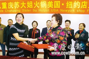 来自纽约的黄女士(左)高兴地与重庆苏大姐火锅董事长苏兴蓉签约。(资料图片)
