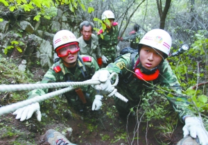 进山搜救的消防员借助绳索攀山前行。昨日,北京五中分校地理老师任铁生在妙峰山失踪已经7天,十余名驴友和8名消防员在当地向导帮助下继续搜寻。截至昨晚,仍未找到任铁生踪迹。家属认为任铁生带着水和食品,尚有生还希望。参与搜救的驴友称:“家属不放弃,我们就搜下去。”今日,搜救仍将继续。 本报记者 王贵彬 摄