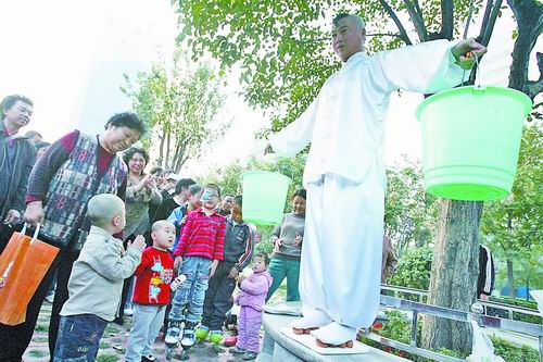 接下来,在围观市民的协助下,陈明把两个盛满水的塑料桶提了起来。10秒钟后,他慢慢从鸡蛋上下来。围观的市民上前查看,8个鸡蛋都“安然无恙”。