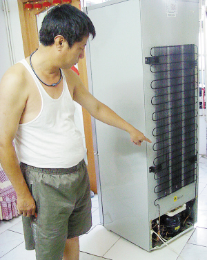 读者难题:读者刘先生2006年10月份买了一台美菱牌电冰箱,使用到今年8月份,发现冰箱出现左冷凝器渗漏现象,维修部运走维修后,将原先内置的冷凝器更换为外放冷凝器。