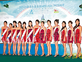 2008年“香港赛区”的13位亚姐佳丽首会传媒。(图片来源:文汇报)