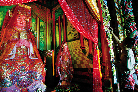 本报讯 记者郑迅、通讯员南宣摄影报道:记者昨天从南沙旅游部门获悉,闻名遐迩的南沙天后宫获民间捐资200多万元,目前正在紧张修缮中。昨天记者前往看到,天后林默(民间称之妈祖)新座像已经请入正殿,殿内初显金碧辉煌。据介绍,正殿内的寝殿及献殿也在作重点修缮,将于10月26日举行隆重开光仪式。