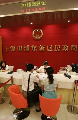 2008年8月8日,一对新人在浦东新区民政局领取结婚证。早报记者 赵昀 图