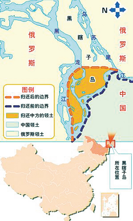 半个黑瞎子岛回归中国 西安新闻网-西安晚报 2008.10.1506:22 关注 昨日,中俄双方在黑瞎子岛举行中华人民共和国与俄罗斯联邦国界东段界桩揭幕仪式。中国边防部队开始按双方勘定的国界线履行防务。 新华社记者 汪永基 摄 黑瞎子岛地理位置图 详见11版