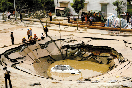 今年9月7日中午12时左右,广州白云区金沙洲沙凤一路突然出现地陷。一辆私家车坠入直径约15米、深约5米的大坑。随后,坑内涌出大量的水把小车淹没,所幸司机及时跳车逃出。据专家会诊分析,此次地陷是突发性的。