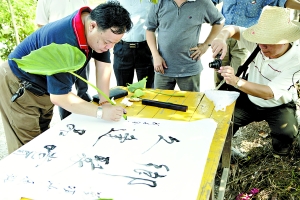 本报讯 (记者叶平生 通讯员南宣)用树枝写在宣纸上的书法你见过吗?在广州的南沙区,有这样一位书法奇人:无论是荔枝、龙眼的树枝,还是香蕉、芋头、火龙果等植物的叶梗,他都可以信手拈来一根,在宣纸上书就一幅漂亮的书法!记者日前在南沙区万顷沙镇原野庄园的火龙果园树下,就目睹了这位书坛奇人的书法奇技。他,就是南沙区书法家协会副主席邓皓明。