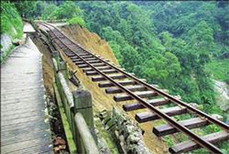台湾阿里山森林铁路再传新灾情,该铁路一路段12日下午发生意外,近70米路基轰然一声,滑落近百米深的山谷中,仅剩铁轨如吊挂钢丝,悬挂半空中(右图),所幸森铁早已因9月中下旬风灾受创未抢通而全线停驶,无人伤亡。铁路通车期因此从原来的11月底延后至明年1月底。