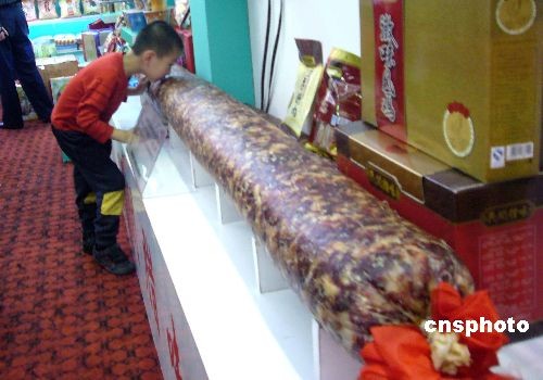 2008年10月16日,第六届中国国际农产品交易会在北京农展馆开幕。一根长2.38米、直径20厘米、重达70公斤的巨型腊肠成为展会一大亮点,吸引了众多观众的目光并驻足观看。 据悉,目前制作此根巨型腊肠的单位正在为它申报世界吉尼斯记录。 中新社发 玉龙 摄
