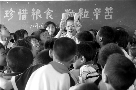 昨日上午8时许,在宜宾高县第二实验小学四年级二班,专门来客串“老师”的农夫陈新贵给孩子们讲述了自己经历过的大饥荒年代。他说,当时生活紧张,粮食供应不足,许多饥饿难忍的人们只有吃树皮草根,吃白泥巴充饥……孩子的心灵被这个真实的故事深深地触动了,一个叫李浩的孩子悄悄地把一个没吃完的馒头用胶袋装好,而以往他总是把妈妈给他准备的早餐(馒头)啃一小半就扔掉了。