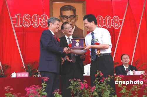 纪念著名爱国侨领李光前先生诞辰一百一十五周年庆典活动,十月十八日在李光前故里、著名侨乡福建南安梅山镇举行。海内外各界人士五千多人参加,深情缅怀李光前的丰功伟绩和道德风范。图为福建南安市委书记骆国清为李光前儿子李成义昆仲颁发捐赠公益事业功勋奖。 中新社发 卓天然 摄