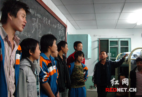 (初二(2)班王强带领同学们唱起了煽情的歌。)