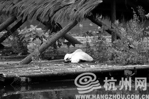 但饲养员说,白天鹅并没有死,只是腹部受了外伤,伤口约有一根手指长。“早上7:00多,我开船靠近天鹅棚,见其他白天鹅都跳下水,只有一只打不起精神,走路也不稳。下水玩了一会后,这只白天鹅又爬回棚里,俯卧在那里不动。给它吃青菜、稻谷,它一口不吃。”