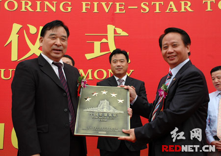 (湖南省星评委主任、省旅游局副局长刘之明(右)向明城国际大酒店董事长吴开明授牌)