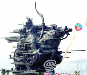 原来,在离“钱王射潮”几百米远的地方,2007年时已竖起韩美林的“钱江龙”雕塑。那个雕塑上有一条正在翻腾的龙,而龙身边就飞腾着一支支利箭。原来钱王的箭早已出手。两个雕塑遥相呼应,是一组艺术品。
