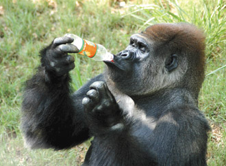 印度动物园里的大猩猩Polo专心喝饮料