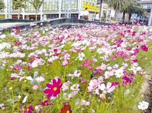 宽带青凤蝶在天一广场花丛中飞舞。记者 林华奇 摄