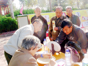 昨天来自全市的1000余名企业退休人员欢聚在胜利社区,阳光洒满老人的脸庞,他们搭起桌子、摆好工具,刻瓷、绘画、毛笔字,样样绝活令人称奇,老人们尽情展示着“老有所乐、老有所为”的幸福生活。