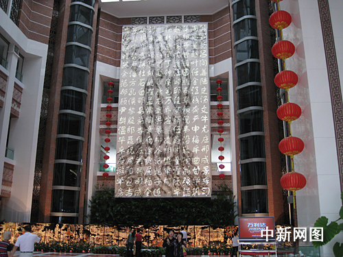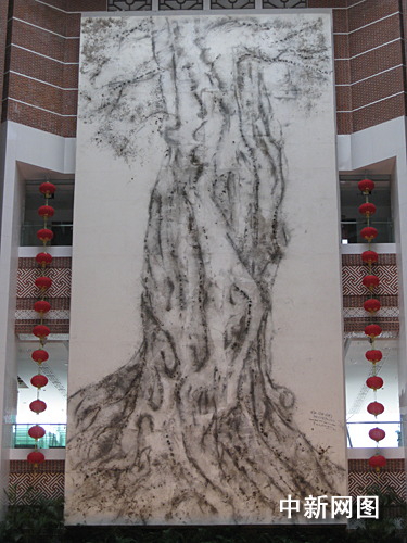 中新网10月25日电 在福建省泉州市的中国闽台缘博物馆大厅内悬挂的巨幅爆绘壁画《同文、同种、同根生 》。该画高18米、宽9米,由旅美华人艺术家蔡国强用火药在特制的麻宣纸上用炸药爆绘。画面由一棵大榕树及树根构成,显现出中国传统百家姓,象征着海峡两岸同胞同文同种、同根同源。
