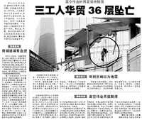 10月20日,朝阳区华贸中心的高楼上突然发出一声巨响,三名高空作业人员在维修36层高的外立面标识时,施工吊篮脱落,造成三人当场死亡,其中一人被连接吊篮的绳索缠住,尸体挂在4层楼高的半空数十分钟。直到目前,事故原因仍在调查中。