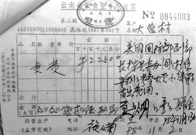 10月20日,在云南宜良县汤池镇三营村的村委办公室里,两份村委会在1998年接待老挝、美国两国政要的报销凭证格外醒目,其中接待老挝国家副主席产生的费用为1530元,而接待美国国防部副部长仅为225元(右图)。