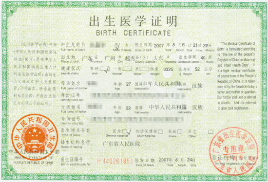 现在,朱小姐也当妈妈了,刚满月的儿子的“出生证”却完全不同了———一本厚厚的绿色小本子,上面用烫金字写着“出生医学证明”,下面还用英文整整齐齐地标示着“BIRTH CERTIFICATE”,翻开内文,电脑打印的项目可真不少,里面除了母亲的情况,还有父亲的年龄、民族、身份证号码,以及婴儿接生机构名称、签发日期等都清清楚楚,此外,这里还有出生医学证明副页和存根,非常正式。“当我拿到孩子的出生证的时候,都激动得差点哭了。”
