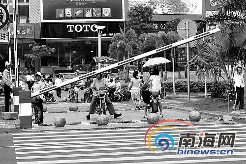 如今,行走在海口街头,已鲜见闯红灯的机动车,这不仅是因为摄像头越来越多,也在于海口机动车驾驶员素质的提高。但是,电动自行车群体的出现,让红绿灯前的安全问题再次成为焦点。为了治理电动自行车闯红灯严重的情况,海口交警无奈之下出奇招,近日在龙昆南路口红绿灯下设置了4根可升降栏杆,红灯时放下、绿灯时抬起,用于拦截乱闯红灯的过路人和电动自行车。