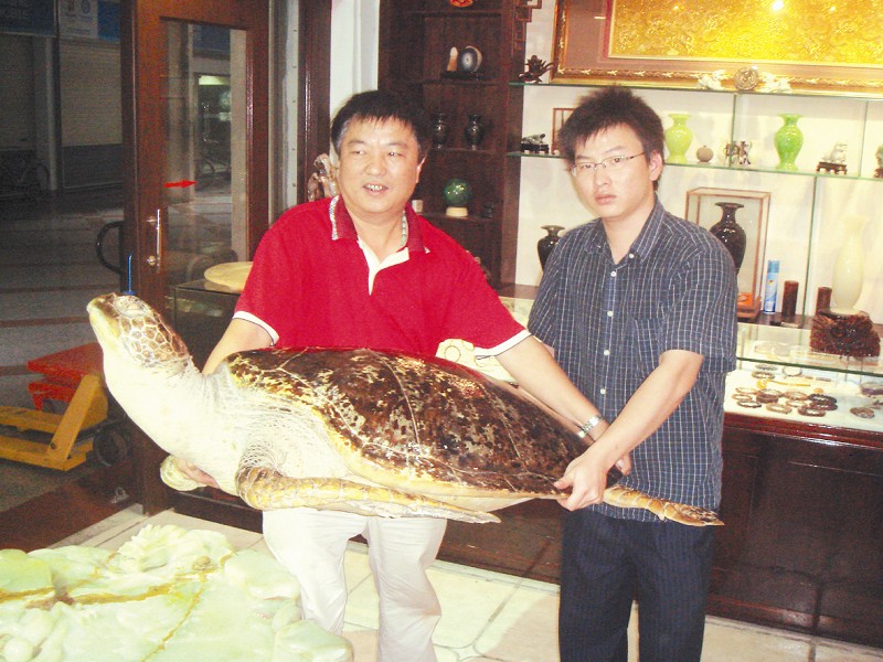 这只海龟身长1.3米,据收藏者李先生说,有专家根据龟壳的长度、宽度和海龟的重量推测,这只海龟的年纪估计有600多岁。有人向他开价20万元,他都舍不得卖。
