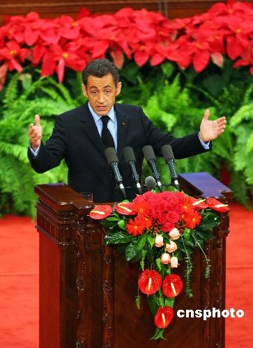 10月24日,第七届亚欧首脑会议在北京人民大会堂开幕。法国总统萨科齐在开幕式上发表讲话。中新社发 廖文静 摄