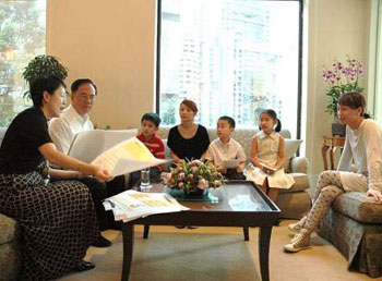 曾荫权在礼宾府接受麦兜创作人麦家碧(右一)及小朋友访问。(图片来源:大公报)