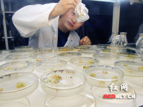 西城杂交水稻实验室内,技术人员正在检验新植株培育状况