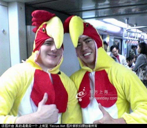 10月30日,网友“真的是最后一个”在论坛上发了一组“惊艳”的照片:地铁4号线车厢内出现一对“公鸡兄弟”。他们身穿鹅黄色公鸡外套,头顶红色鸡冠,臀部翘着红色尾羽。从照片上看,其中一人是外籍人士。面对镜头,这对“公鸡兄弟”显得十分得意,摆出多种姿势配合乘客拍照。