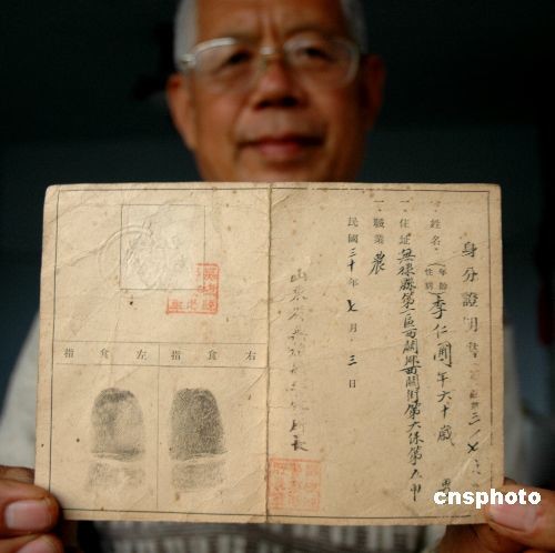 2008年11月2日,一张尘封了67年的民国时期身份证在山东滨州无棣露面。令人惊奇的是,这张1941年的纸质简易身份证上照片下方竟印有本人的指纹。 而这恰恰是我国未来身份证件要补充添加的内容之一。这张《身份证明书》主人为山东省无棣县人,姓名李仁浦,编号3176,发证日期为民国三十年(1941年),签发人为山东省无棣县警察所所长,并盖有“无棣县警察所所长章”与钢印,上面有职业(行业)、性别、年龄、像片等信息。令人叫绝的是,这张简易的纸质身份证上竟有左食指、右食指标准指纹,这同如今推行的指纹识别系统,有着异曲同工之妙。同时,该身份证注意事项一栏还特别指出,“须常携带、不得转借他人”。中新社发 梁宝海 摄
