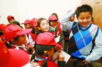 在《一家老小向前冲》拍片间隙,饰演天乐的小演员李俊豪正接受晚报校园记者们的采访,可能是第一次被同龄人采访,“小天乐”有点不好意思,直吐舌头。