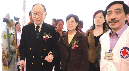 与她一起参加仪式的香港红十字会主席杨铁梁已经80高龄了,杨老先生拄着拐杖,曾鲍笑薇一直搀扶着他走进中心大门。
