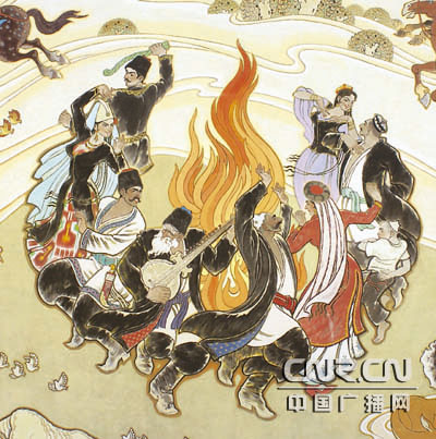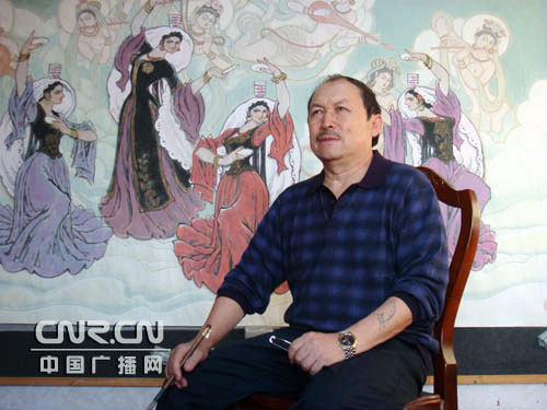国画家吐尔地·依明中广网新疆11月4日消息(记者胡志坚 李小倩)“祥云,飞天,民族歌舞;远古,现代,丝绸之路。”10月19日,在新疆第二届国画展上,一幅名为《丝路乐舞》的大型国画引起了众多参观者的驻足。画面上美丽的新疆姑娘在跳着传统的顶碗舞,而背景则是新疆克孜尔千佛洞的飞天壁画。一位女士出神的看着这幅画:“颜色用的相当漂亮,深淡浅太好看了。人也画的好看、传神,你看把那个民族的舞姿全都都表现出来了。上面画的也是美人,下面画的也是美人,多好看。”而当参观者们低头看到这幅画的落款时,不禁惊奇的发现作者竟然是一位维吾尔族画家。这位维吾尔族画家名叫吐尔地·依明,他是目前新疆唯一一位在中国画上取得杰出成就的维吾尔族画家。