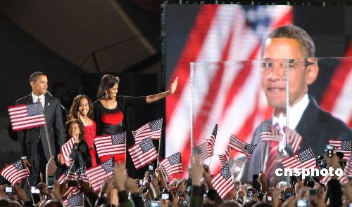 美国民主党总统候选人奥巴马当地时间11月4日赢得美国大选,将成为美国历史上第一位黑人总统。图为奥巴马与妻儿在芝加哥庆祝晚会现场。中新社发 李静 摄