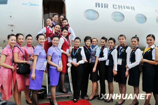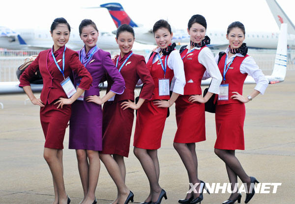 11月6日,参赛空姐在飞机前合影。新华社记者 魏培全 摄