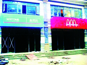 昨天,南京市民蒋先生上班途经文安街时,被马路南侧一座大楼的底层商铺给“雷翻”,“差点一头栽进花坛里”。林立的店铺清一色是山寨名牌店铺,其中屈臣氏、必胜客、麦当劳、李宁、星巴克、哈根达斯等分别被克隆成曲同氏、必胜糊、李明、巴克星、哈根波斯等。而麦当劳的经典m形标志,被多加了一个弯,成了“三扇门”。现代快报记者看到,这些挂了招牌的商铺并没有一家正式开张。