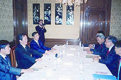 2005年6月30日和7月1日两天,朱维群(前排中)和有关部门负责人与达赖喇嘛私人代表甲日·洛迪(前排右一)在中华人民共和国驻瑞士伯尔尼大使馆举行第四轮接触。