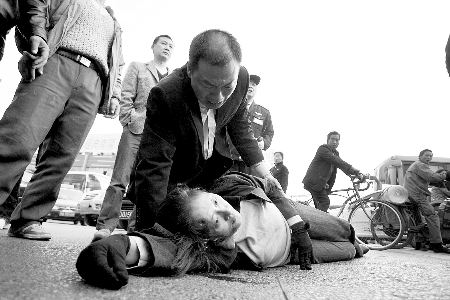 一辆三轮摩托与摩托车相撞了,摩托车驾驶员一边抽搐一边淌血,郑州市民周先生说,自己打算上前帮忙,但被周围人阻止,20分钟后救护车赶到现场时,摩托车驾驶员的心电图已经变成了直线。“没扶他我错了吗?”周先生哆嗦着说。