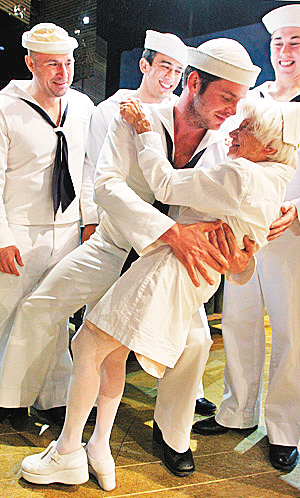 沙因10日在纽约观看经典舞台剧《南太平洋战争》。她如1945年一样身着一套白色护士制服,走上舞台与在剧中扮演水手的5名演员合影留念。