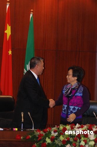 十一月十一日下午,澳门特区政府行政长官何厚铧在立法会发表二〇〇九年财政年度施政报告。结束后,何厚铧向立法会主席曹其真握手致意。中新社发 毕永光 摄